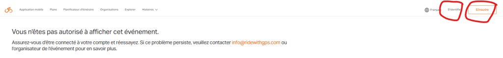 - Choisir votre randonnée sur le calendrier et cliquer sur le logo « Ride with GPS » dans la description de la randonnée. Si une erreur apparaît, c’est que vous n’êtes pas connecté à votre compte « personnel » Ride with GPS. Lorsque vous serez connecté la randonnée devrait apparaître.