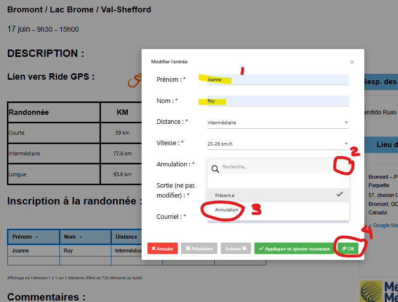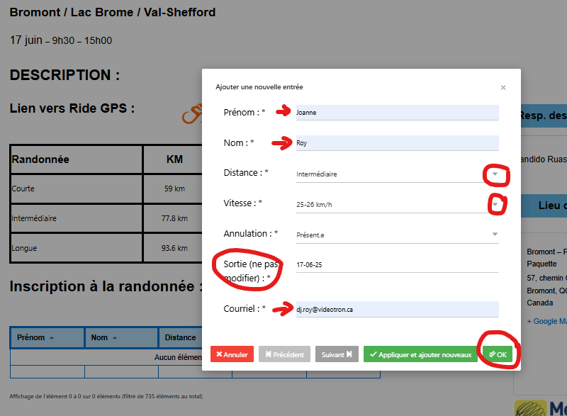 Remplir le formulaire (si vous êtes connecté au site (ce n’est pas une obligation) votre nom, prénom et groupe de vitesse devrait apparaître automatiquement.