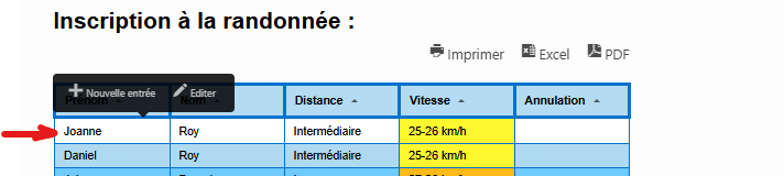 Cliquer sur un prénom déjà inscrit ou sur la première ligne (bleue)